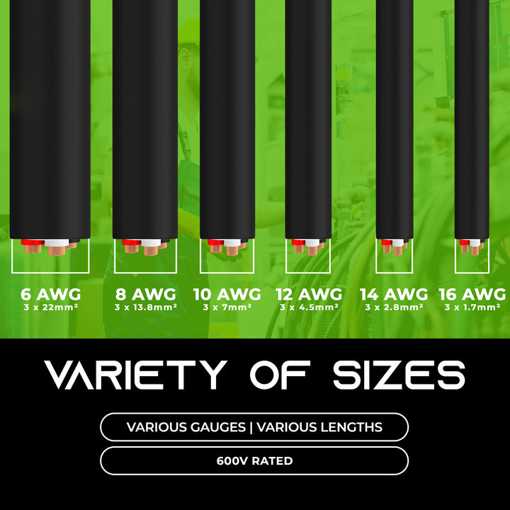 • Heavy Duty 14 AWG 600V SOOW (Service, Oil, and Water Resistant) cable is a type of electrical wire that is commonly used in industrial, commercial, and outdoor applications. It is insulated, and is covered by a durable rubber jacket that provides resistance to oils, acids, water, and chemicals, making it a durable and long-lasting option for harsh environments (-40C to 90 Celcius).