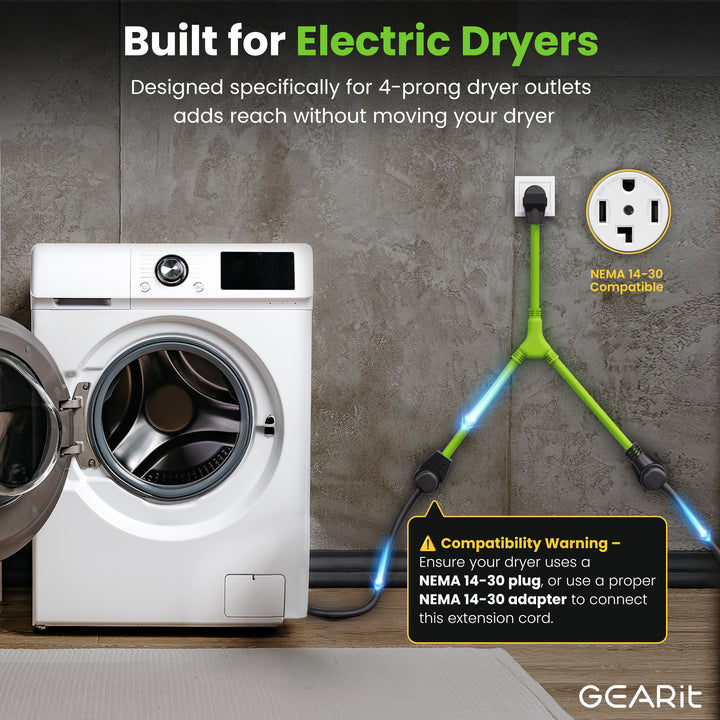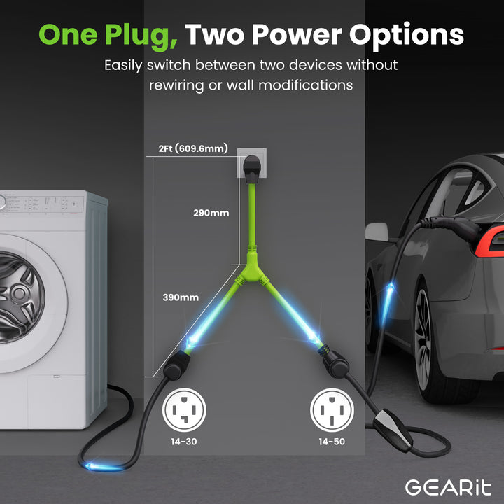 30 Amp Y outlet splitter Cord from GEARit allows voltages between 125 to 250V and supports up to 7500Watts. This is a STW Rated 4-prong adapter extension cord with NEMA 14-30P/14-50R/14-30R, connectors. Female connectors from outdoor extension cord multiple outlet have ergonomic handles for easy plug and unplug. This 2.2ft cable cord is perfect to connect dryers, vehicles and trailers.
