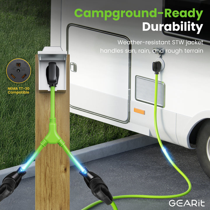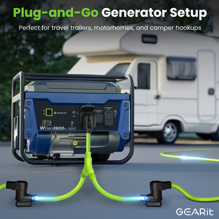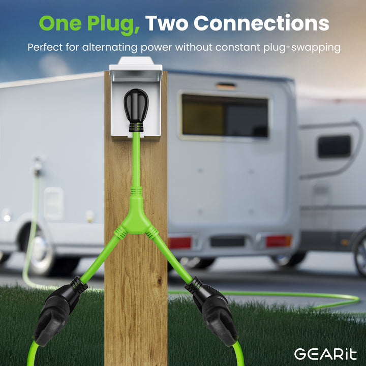 The GEARit Y-splitter adapter facilitates simultaneous connection of your RV and generator. With a 3 ft cable, heavy-duty capacity (125V | 3750 Watts), and two receptacles, it's the perfect solution.