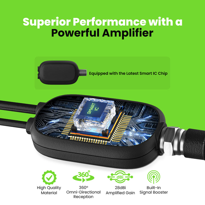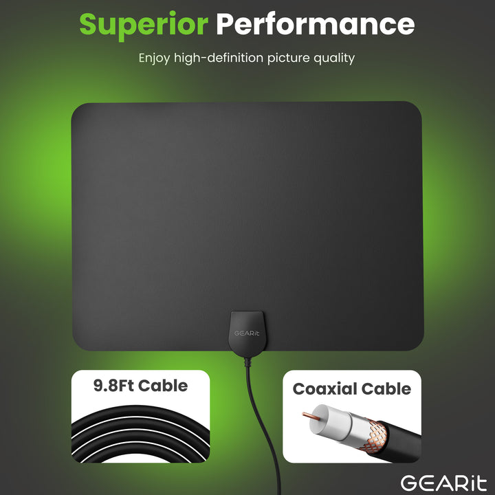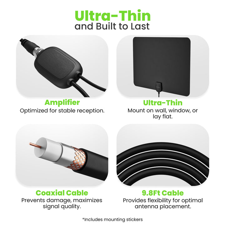 This durable flat antenna includes a built-in high-quality 9.8ft coaxial cable, ensuring reliable performance and long-lasting use.