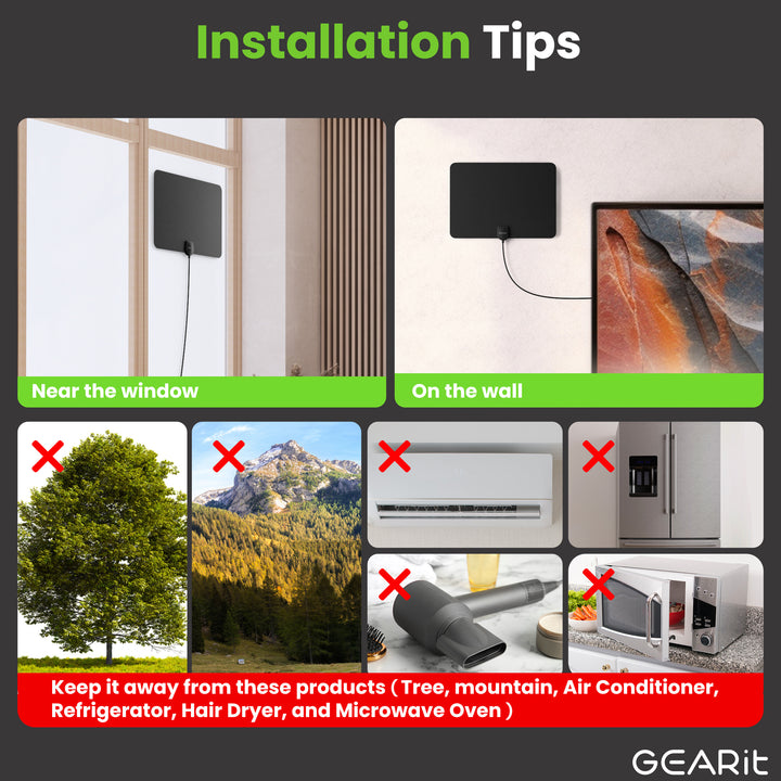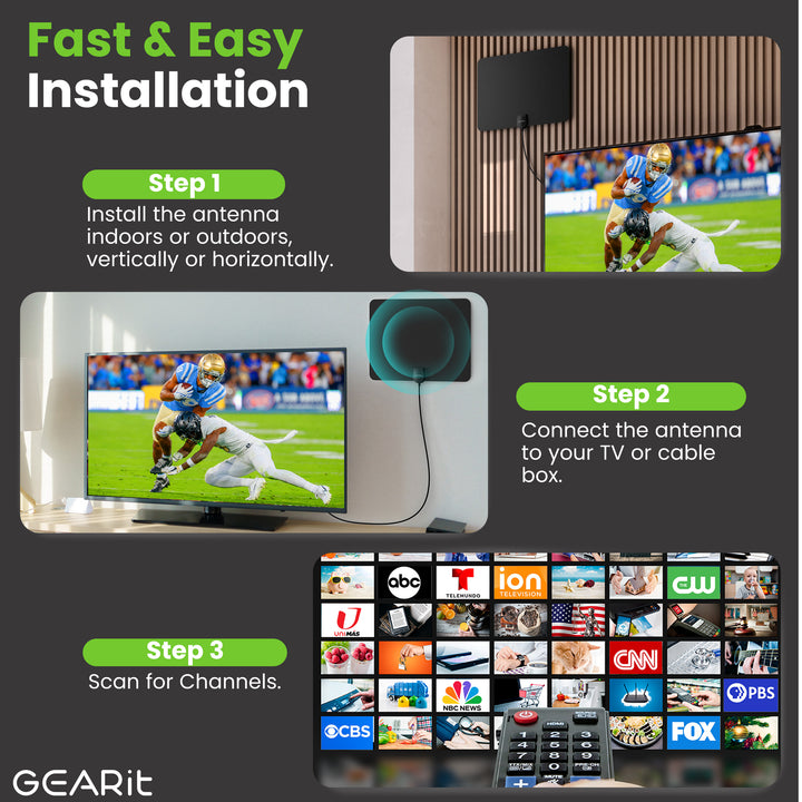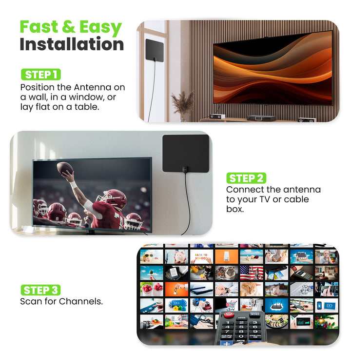 Install this ultra-thin flat TV antenna with included mounting stickers and a 9.8ft coaxial cable. Place it vertically or horizontally on a wall or window. Connect to the ANT/IN port, scan for channels, and start watching! Readjust positioning and re-scan to find the best signal for your location.