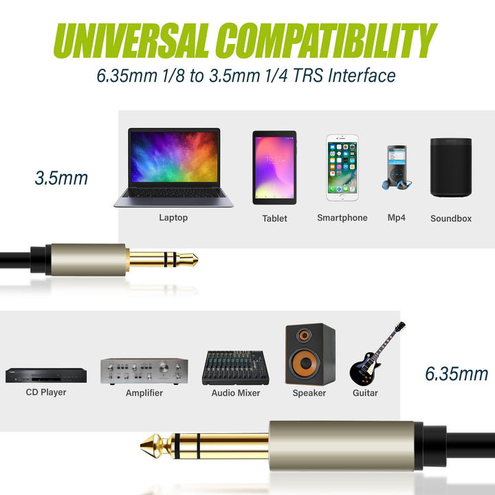• PROFESSIONAL GRADE - Interconnect harmoniously speaker, receiver, amplifier, mixer, Hi-Fi stereo, home theater, recording equipment or similar device with 6.35mm 1/4" TS Mono Stereo jack inputs and 3.5mm 1/8" TRS output to iPhone, PC/Laptop or similar device
