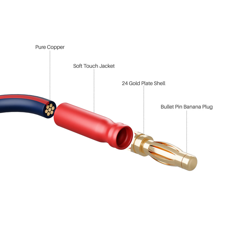 • SOFT TOUCH SPEAKER CABLE BANANA TIP - Our 14g high end terminated speaker wire with banana tips come with a soft touch jacket and color coding to distinguish polarity. Typically, a red banana tip is positive and white banana tip is negative.