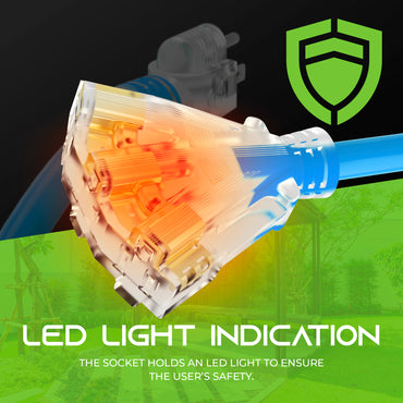 • SAFETY & VISIBILITY - UL and CUL safety certifications. The translucent female plug end has a lighted LED indicator when the cord delivering power. The Blue cable jacket is highly visible, easy to spot and prevents accidents.