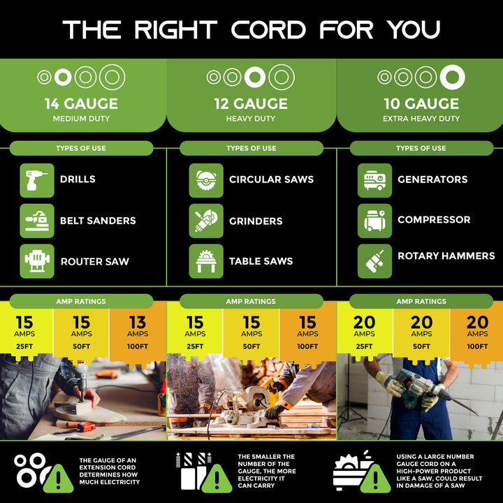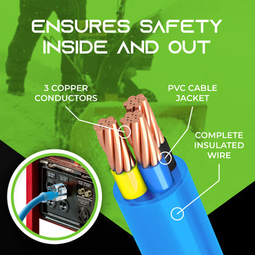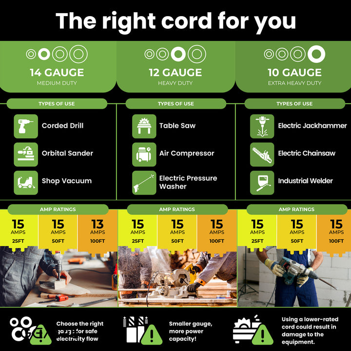 Engineered for resilience, this all-weather cord is perfect for construction sites, storage facilities, residential areas, and commercial spaces, withstanding conditions like rain, sleet, and snow. It’s a versatile companion for both heavy and light-duty power tools, generators, drills, saws, air compressors, garden tools, heating units, chargers, and beyond.