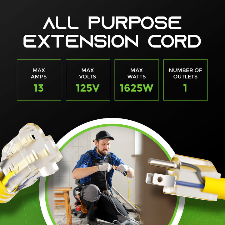 Engineered for resilience, this all-weather cord is perfect for construction sites, storage facilities, residential areas, and commercial spaces, withstanding conditions like rain, sleet, and snow. It’s a versatile companion for both heavy and light-duty power tools, generators, drills, saws, air compressors, garden tools, heating units, chargers, and beyond.