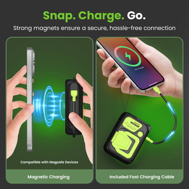- Adventure - Ready Companion - Our magnetic wireless charger is compact enough for any bag but powerful enough for your phone and other devices. Built - in cables mean no tangled mess, while MagSafe compatibility keeps your iPhone securely attached while ch arging.