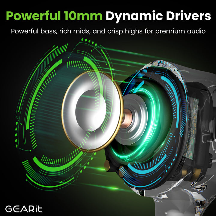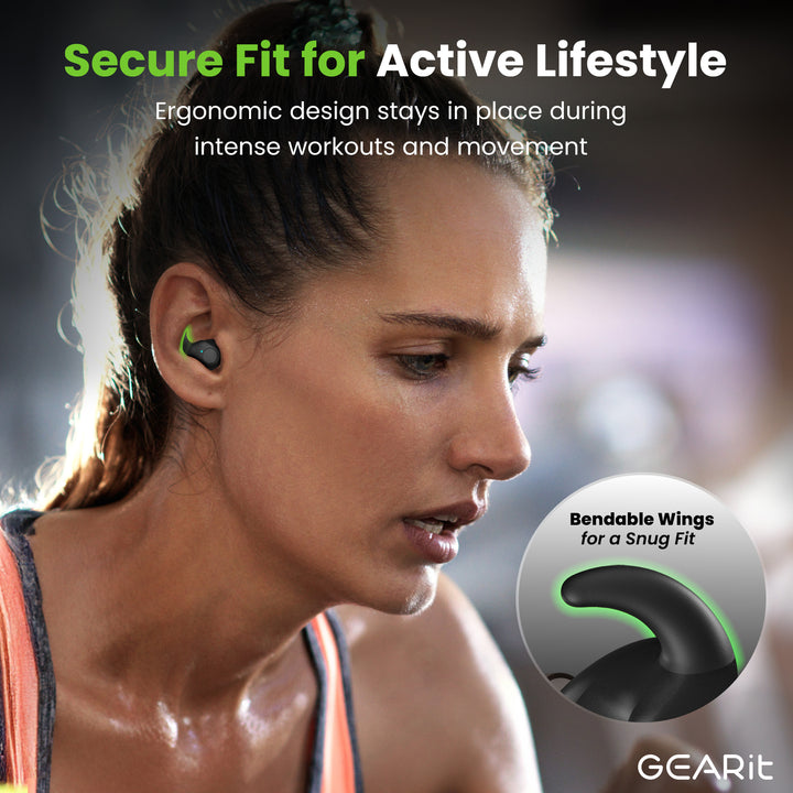 - Workout Earbuds with Secure Fit: GEARit's Wireless Earbuds feature flexible, secure-fit wingtips that hug your ears and deliver rock-solid stability through every lunge, lift, and run. They stay securely in place, no matter how intense your workout gets.