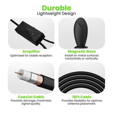 This durable antenna features a sturdy magnetic base for easy installation on metal surfaces and includes a 16ft coaxial cable, ensuring reliable performance and long-lasting use.